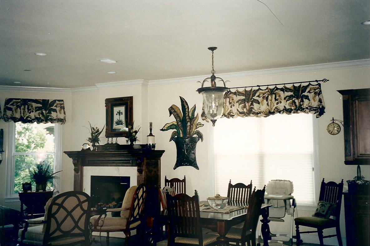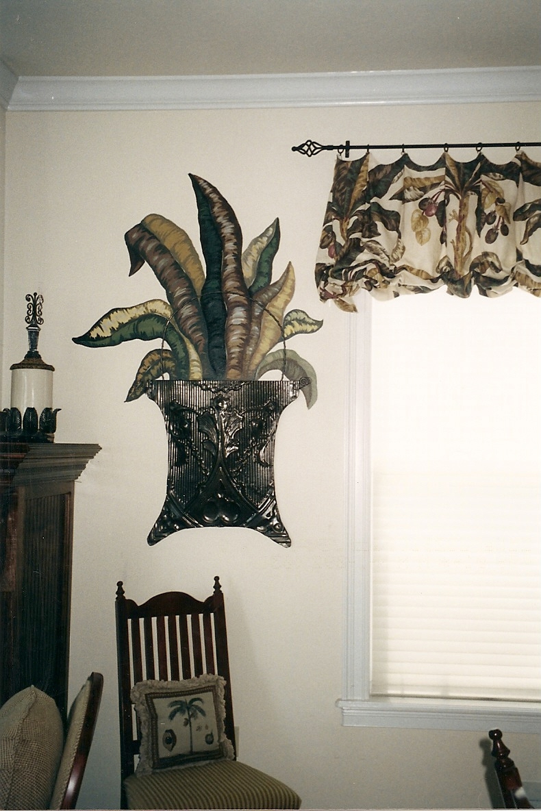 Faux leaves in a real metal basket match the fabric valences and the tropical theme of the room.
