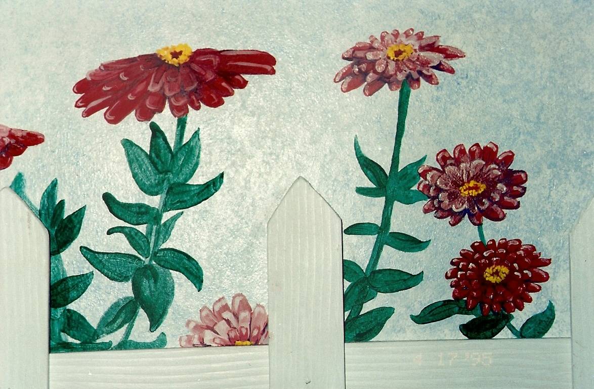 A short kitchen wall blooms with painted zinnias. Real pickets add dimension.