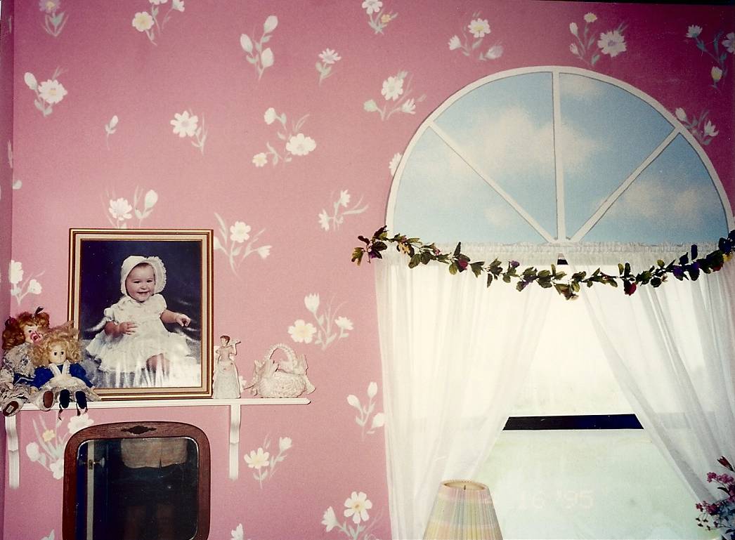 A faux stone arch surrounds a country scene. The background is a red rag roll.