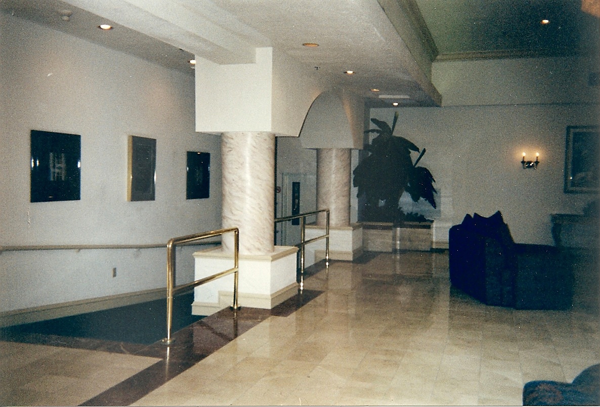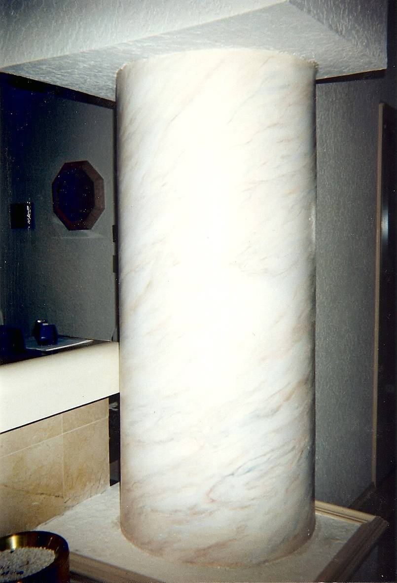 Plaster columns in a Miami hotel are painted to match the marble tile floor.