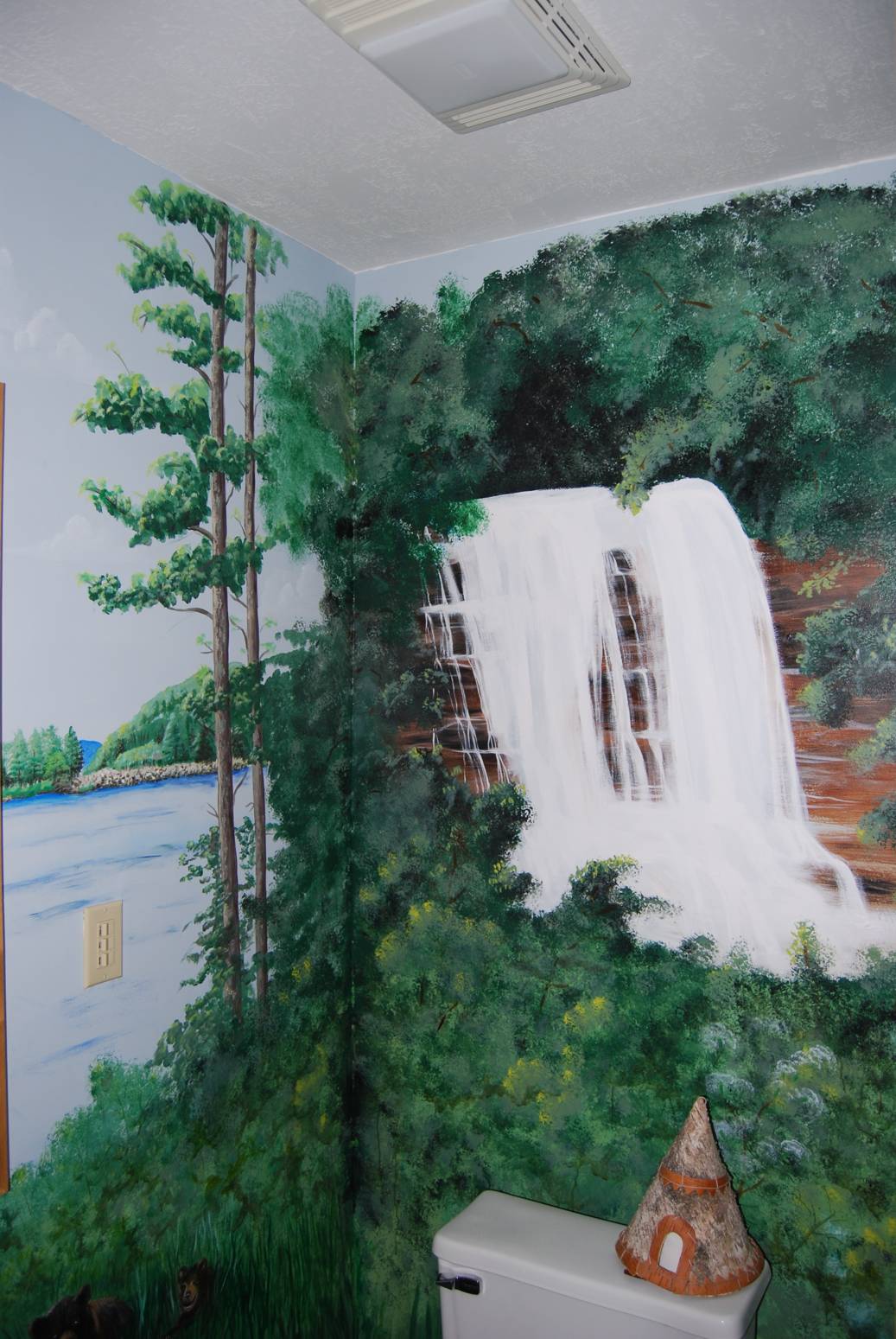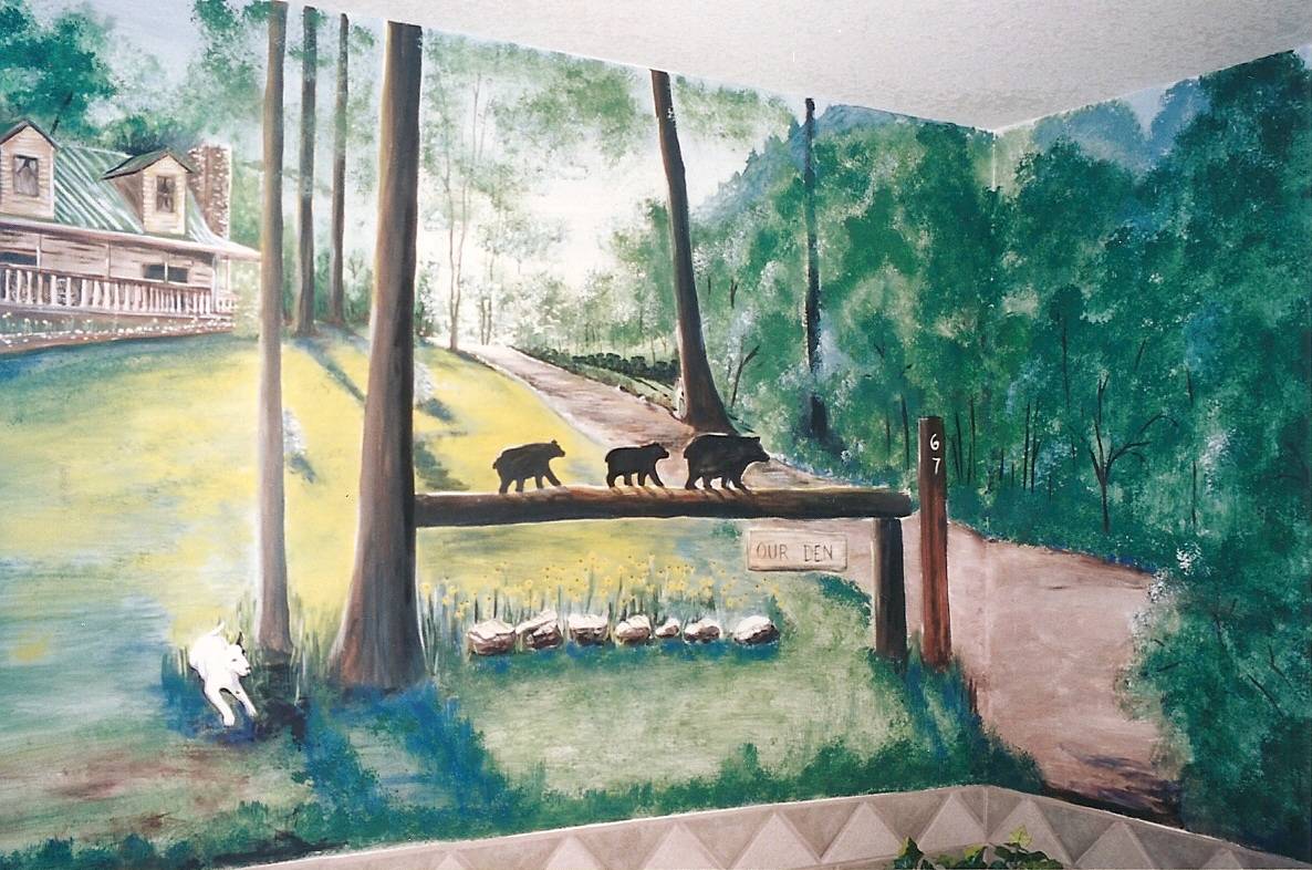 Cabin portrait (with bears) on a wall.