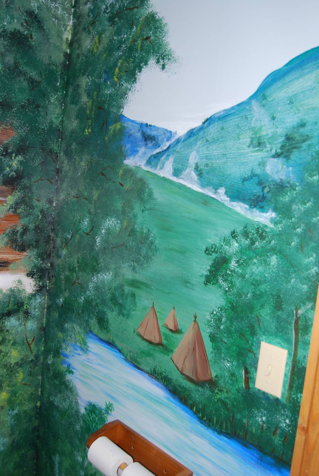 Murals and textures accent the natural beauty of a mountain cabin.