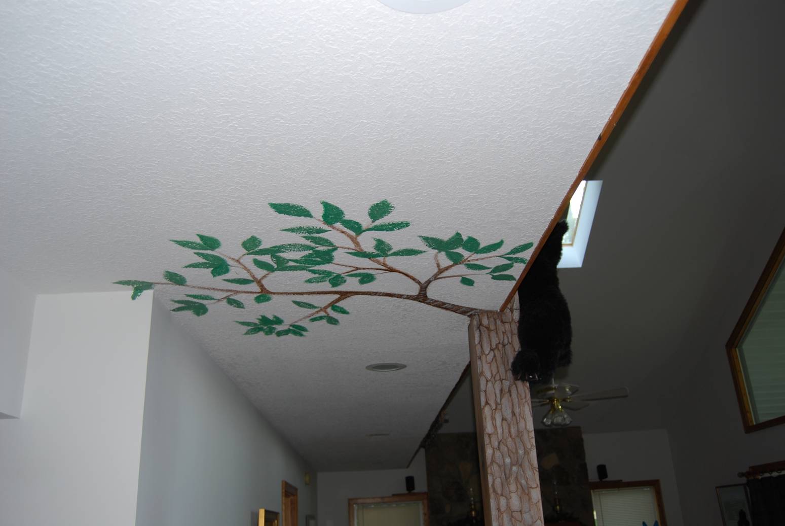A plush bear climbs a painted tree.